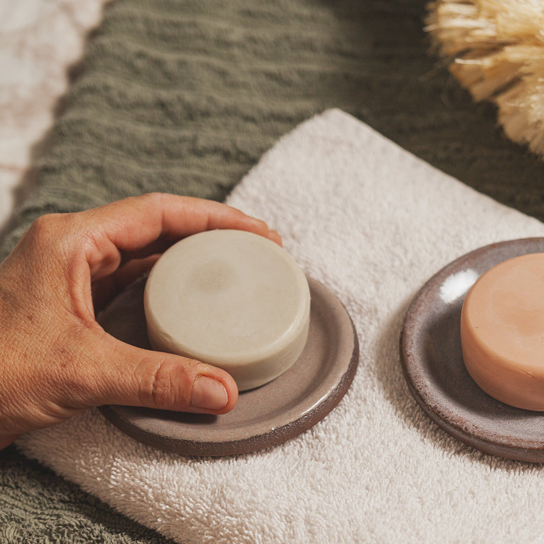INGREDIENTES: Aceite de coco, cera de abeja, manteca de Karité, fécula de maíz, bicarbonato de sodio, arcilla verde, vitamina E y aceite esencial de árbol de té.