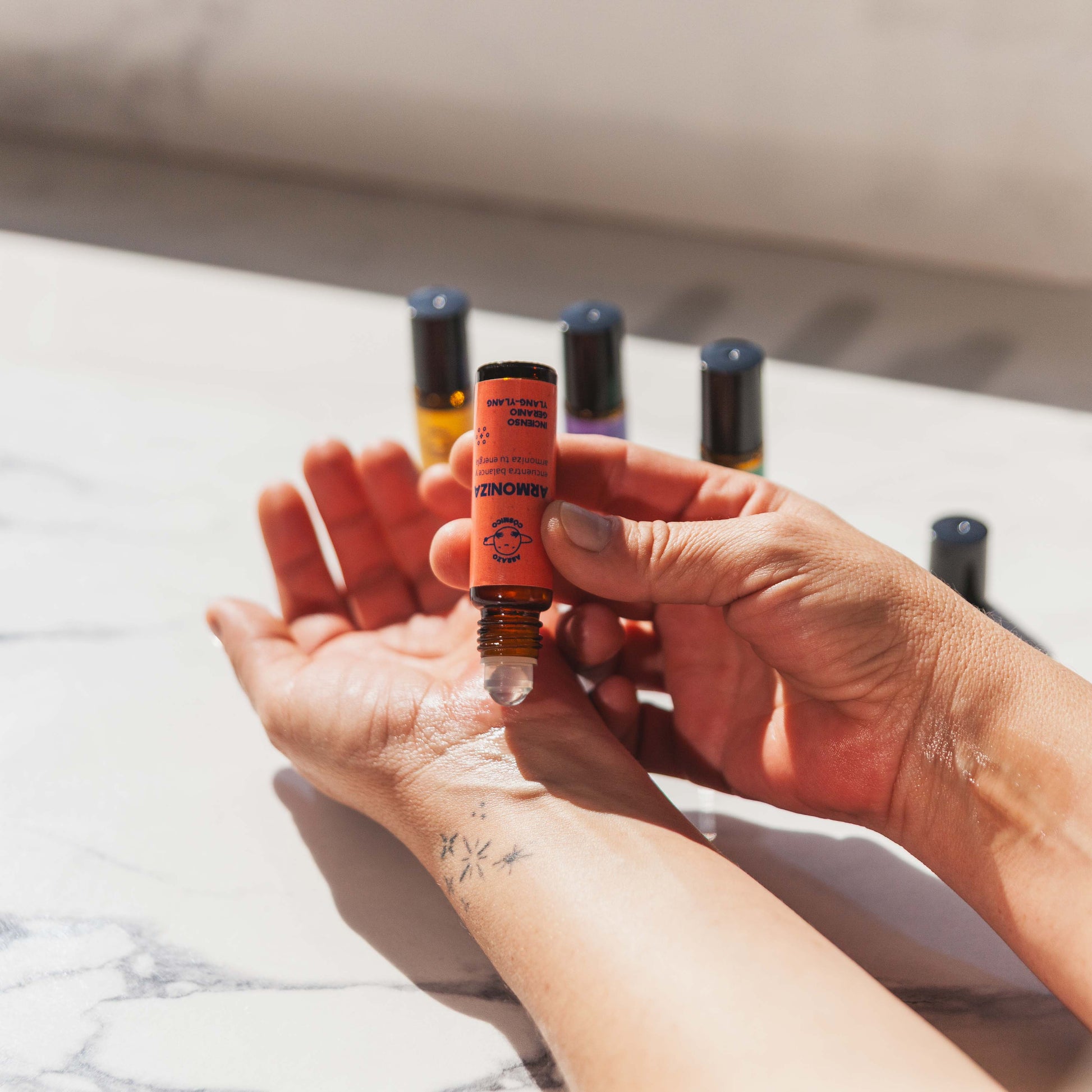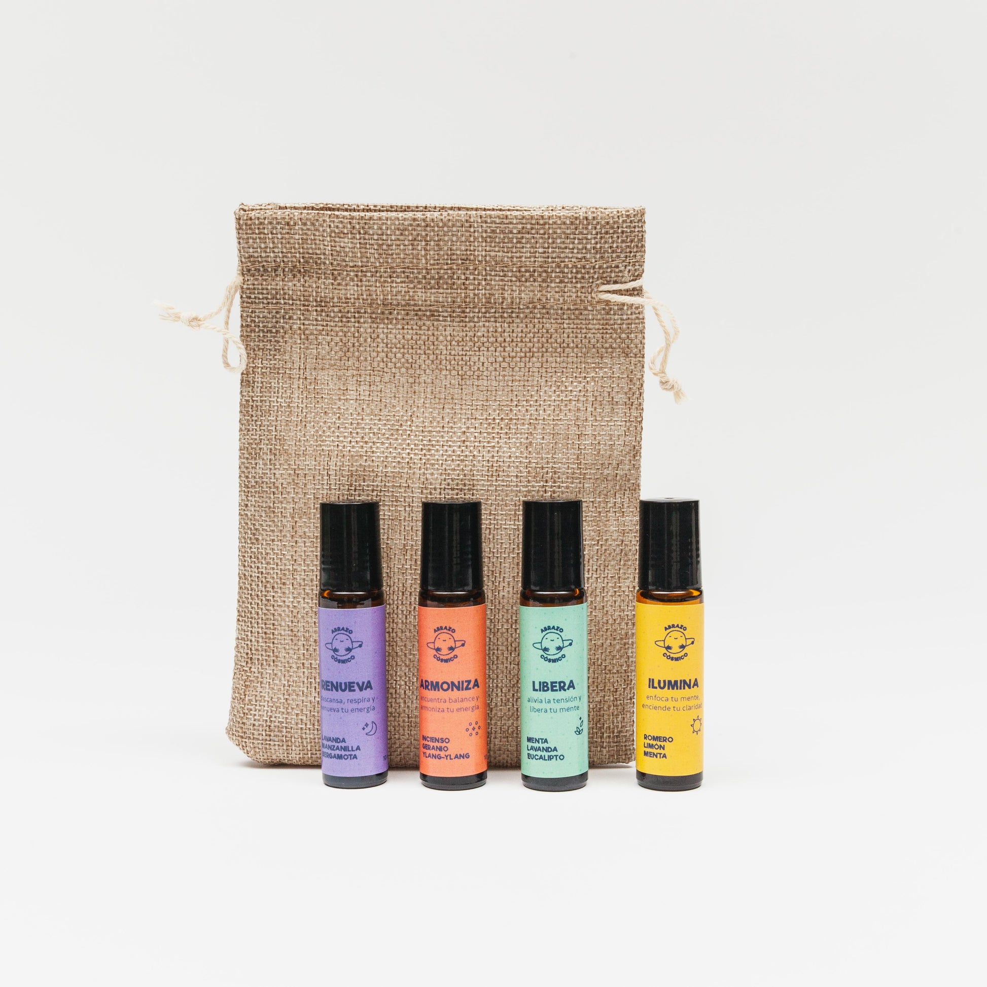Una coleccion de 4 Escencias Cósmicas en roll on de aromaterapia elaborados con aceites esenciales puros y base de aceites vegetales. Cada sinergia esta formulada con intencion energetica para acompañarte en tu dia a dia: renovar, iluminar, liberar o armonizar tu energía según lo necesites. Una forma sencilla y natural de recoenctar contigo en todo momento.